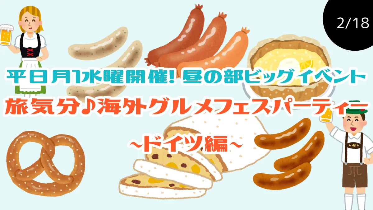 - 平日月1水曜開催!昼の部ビックイベント!! 旅気分♪海外グルメフェスパーティー ~ドイツ編~